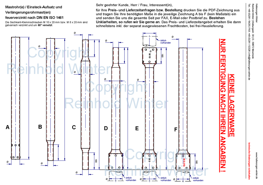 Für Ihre Preis- und Lieferzeitanfrage bzw. Bestellung, drucken Sie die PDF-Zeichnung aus und tragen Sie Ihre benötigten Maße in die jeweilige Zeichnung A bis E (kein Maßstab) ein und senden uns die gesamten Seiten per E-Mail oder Postbrief zu.