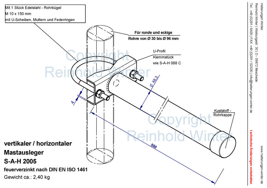 - Befestigung mit Edelstahl-Rohrbügel M 10 x 150 mm inkl. U-Scheiben usw., sowie Kunststoff-Rohrendkappe